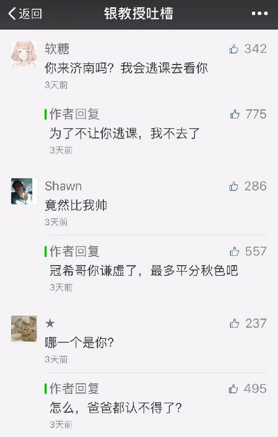 银教授吐槽是微博搞笑博主银教授开设的公众号,可能段子不一定让你发笑(相信我,爱到深处自然黑),但是网友的评论非常有趣并大多以调侃为主,在回复中银教授也时刻保持段子手的幽默。