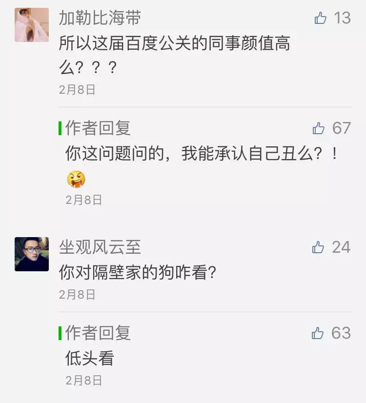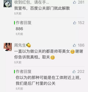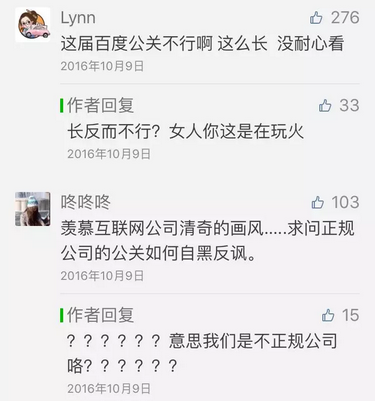 2016 年的百度出了不少事件,血友病吧、魏则西事件及刘超等将百度推到风口浪尖,得到诸多网友的口诛笔伐。身为“BAT”一员,危机事件发生后如何进行公关处理挽救企业形象、降低损失,同样备受网友关注。而百度对 16 年几大事件的处理方式都未能让网友“满意”,不少网友讥讽道——“这届百度公关不太行”。结果不久后,百度公关开始自嘲为“这届百度公关”,除了开设知乎机构号,在 16 年 7 月份也开通了公众号。公众号简介很简洁——“我们就是大家觉得不太行的这届百度公关”,似乎铁了心要走自黑路线一路黑到底。尽管开通时间不长,发文也不是很多,但就评论来看,公众号俨然收获了一批“忠实粉”~