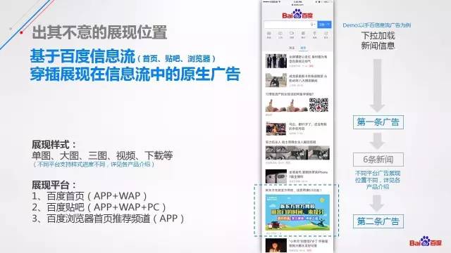 目前可以在手机百度,贴吧或者浏览器三个平台进行投放。展现样式分为单图,大图,三图,视频,下载等。