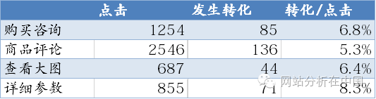 如果,我们再接着进一步挖掘数据,发现各个微转化元素被点击之后最终发生的购买转化情况,我们又能得到什么样的分析呢?