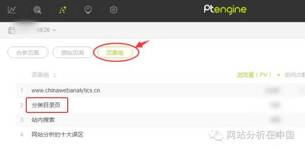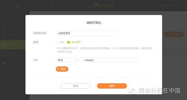 第一步:集合页面。下图中显示了我将我的博客(www.chinawebanalytics.cn)中所有的category页面集合在一起的设置,这些页面的URL中都包含“category”。我将这个页面组命名为“分类目录页”。下图点击小图可以看到原尺寸的大图。