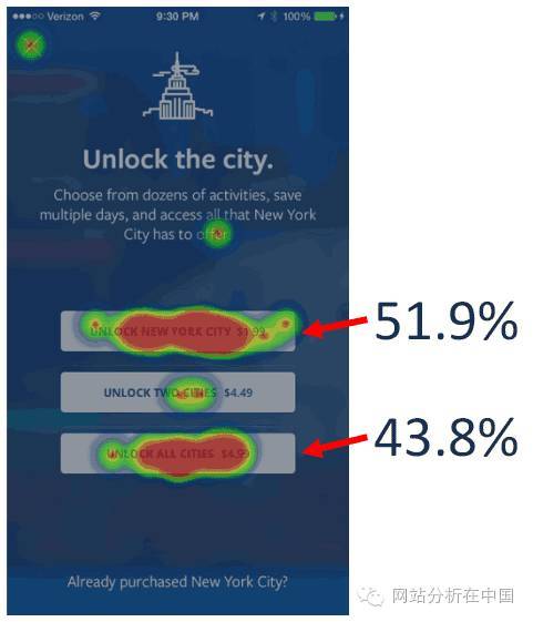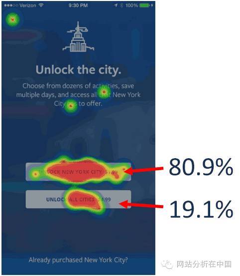 显然,新的设计突然激发了人们“占小便宜”的愉悦心理,从而迅速挽救了之前“解锁全部城市”的糟糕表现。你可以看到热图是多么直观快速的说明了这个问题。