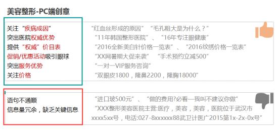 ③ 无线创意撰写较弱,不符合无线端用户的搜索习惯:医疗行业无线端消费占比已经达到84%以上,无线端搜索关键词的长度较长,通配符受限,如果只是简单粗暴的使用通配符一样会造成实际展现效果很差。