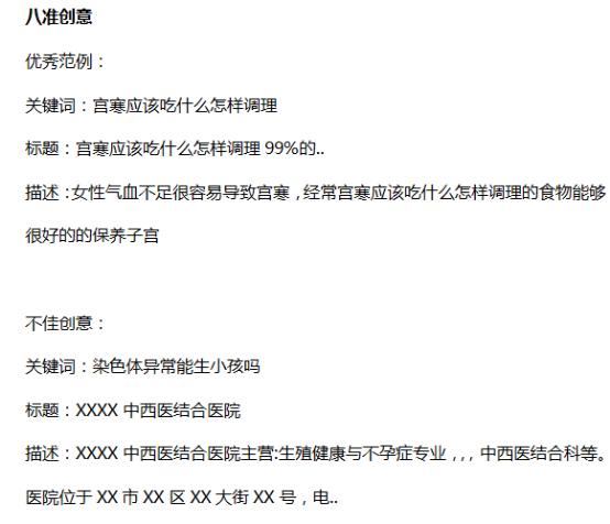 解决方案:根据我们目前的了解和相关政策解读,创意符合“八不准”原则是目前搜索引擎所执行的要求,因此,认真研究“八不准”,发挥文案功底,重新撰写关注度和点击率高的创意,降低广告感,是目前的重点。