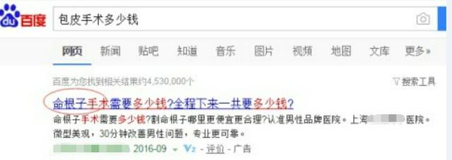 作为一个专业的医疗行业SEMer,也应该不断反思这样的问题:“求医者真正在找寻的是什么样的信息?想点击的是怎么样的内容?”,这个问题没有标准答案,但是可以肯定的是,他们找的肯定不是一眼就能看出来的赤裸裸的广告,何况还是广告语都残缺不全的广告。