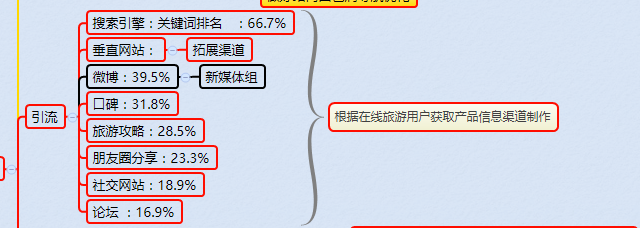 每一阶段目标需要规划好自已的优化指标我给自已定的第一阶段目标有重要的两个指标:引流:根据在线旅游用户获取产品信息渠道制作制定以下推广渠道