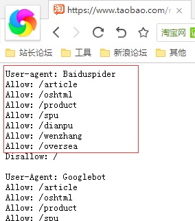 今天收到一个重磅消息就是淘宝对百度蜘蛛开放部分目录了,于是赶紧打开淘宝robots协议看看,果不其然,淘宝对百度开放了7个目录,如下图: