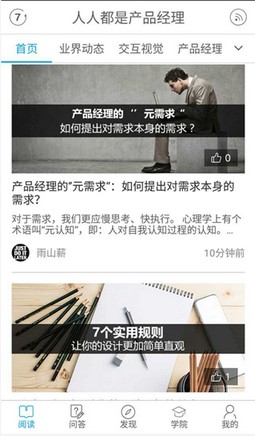 我们会发现人人都是产品经理的app端有了很大的提升2.x版本还是大封面,大标题的设计,现在已经变成了大标题小配图的设计了。