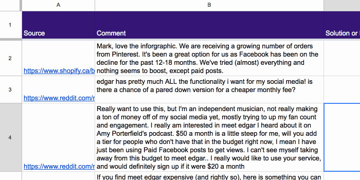 你可以把所有与你的假设相关的内容复制、粘贴到电子表格里,广撒网,不要做过多的编辑,不用过多久,你就会开始用用户的语言制作pitch。