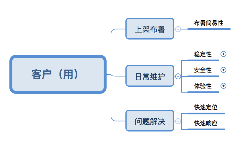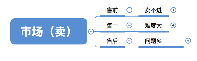 to B行业的某种硬件产品,由于这种类型的产品所涉及到的问题比较复杂,它除了直接使用产品的客户,还有一线市场人员销售产品中遇到的困难,把产品销售到使用过程中,所有可能遇到的问题都描述出来,如下图所示: