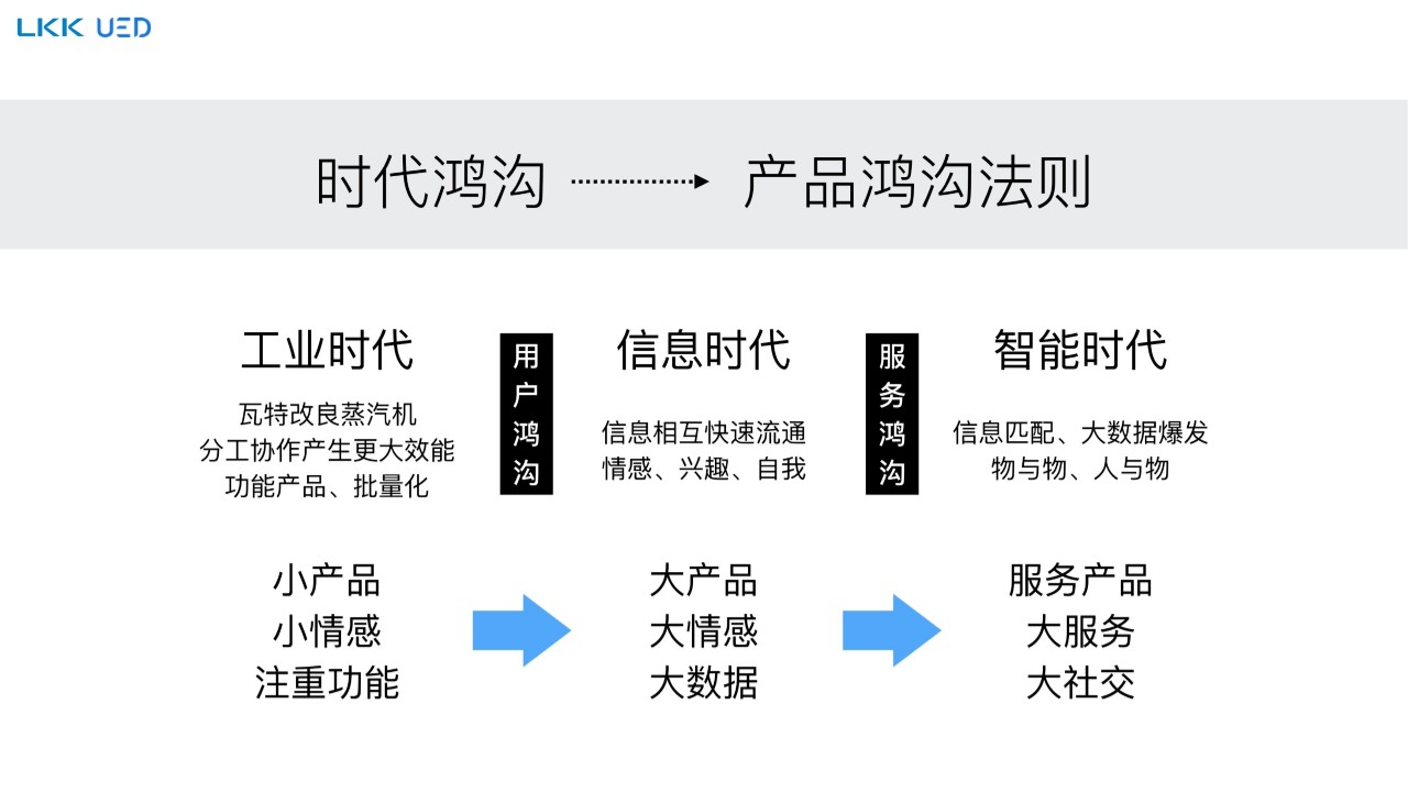 从工业时代开始分工协作去产生更大的效能,产品更注重功能和批量化。进入到信息时代,信息的相互快速流通它更注重的是用户的情感兴趣跟自我。然后再到智能时代,信息的匹配、数据的爆发,更加关注物与物、人与物之间的关系。所以每个时代之间它都会有一个鸿沟,从工业时代到信息时代跨越的是用户鸿沟,从关注产品本身到关注用户。从信息时代到智能时代跨越的是服务鸿沟,从关注用户到关注服务。每个时代对产品和服务都有不同的要求。