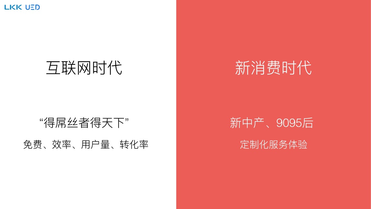 从互联网时代到新消费时代目前正处于从互联网时代到新消费时代的过程,在互联网时代盛行的时候有一个非常好的口头禅叫得屌丝者得天下。大家在追求的是免费、效率、用户量、转化率等等这些属于非常高效快速时代的非常典型特征。到新消费时代的改变就是我们大量的用户它慢慢变成新中产或者说90后95后这样的群体。它是整个市场最庞大的生力军,在这个层面上价格并不是关注的核心,它需要的是更完整的更定制化的服务体验。