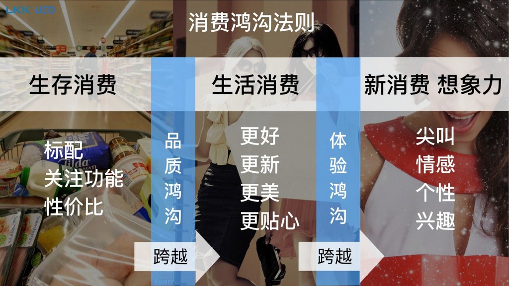 所以也存在一个进阶的方式,从最早的考虑性价比的生存消费到上升到用户需要更好、更贴心、更美的服务方式,作为我们销售或消费的匹配。再往下一层现在需要新的消费想象力,在这个层面上我们的产品需要具有情感、有个性,需要能够引发用户的兴趣。