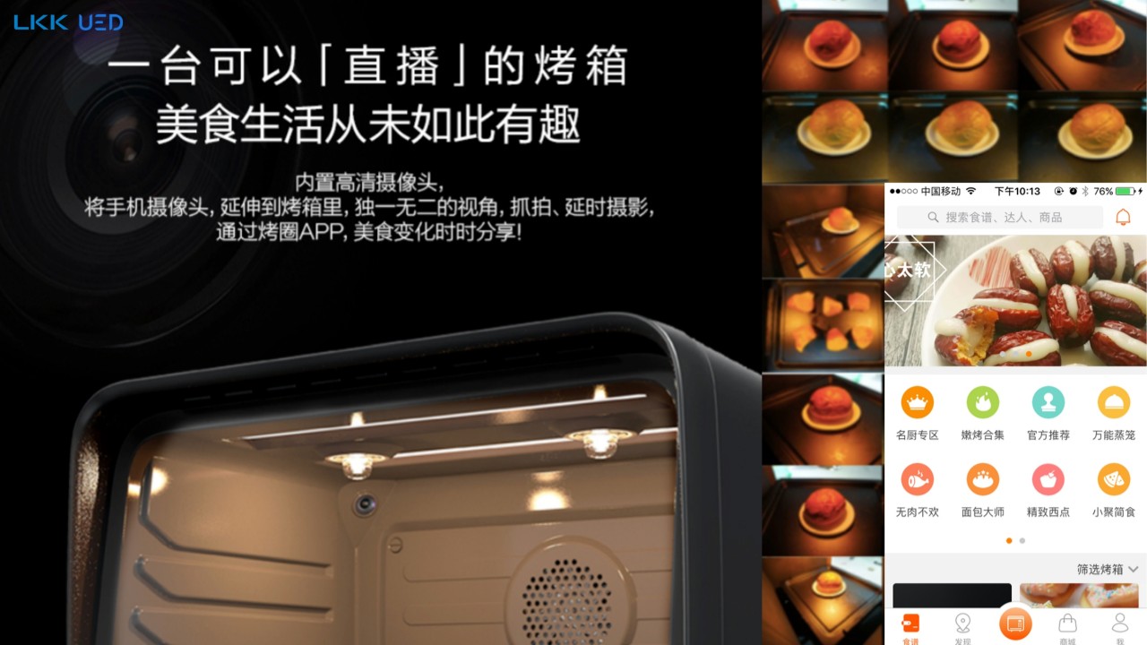 举个例子,针对烘焙爱好者推出新型的烤箱,这个烤箱它里面内置高清摄像头它可以记录完整烘焙的过程,在里面去做一个直播,通过它的烤圈APP你能够看到一个面团,它从原始的状态慢慢变成一个非常美味的过程,并且可以在烤圈APP里分享我的美食,分享烘焙方法,由此圈定我的整个社交圈。