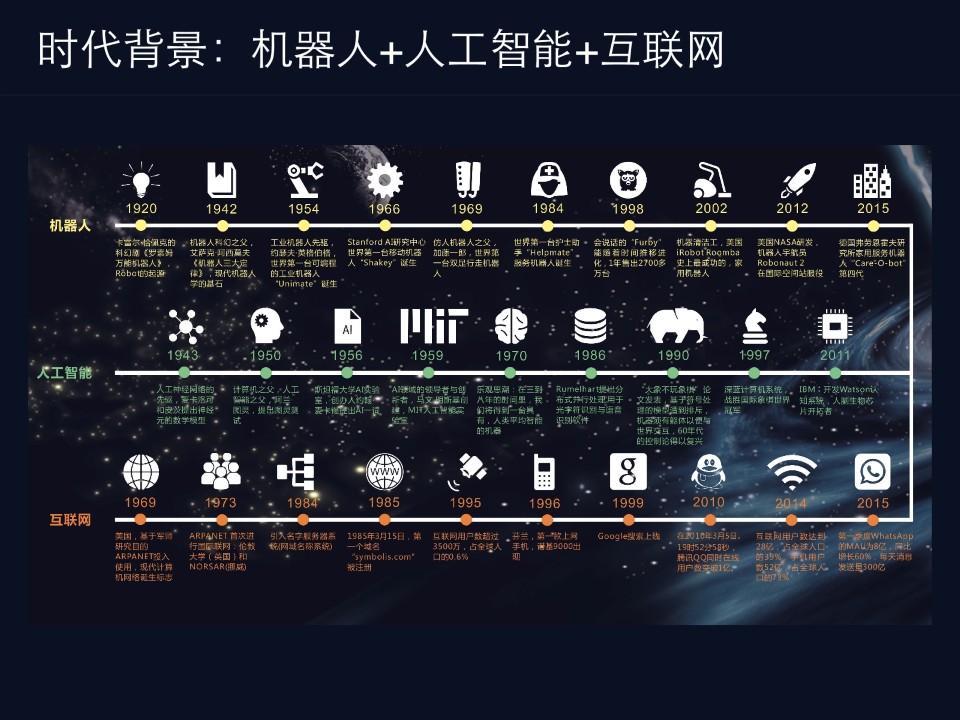 时代背景上个世纪机器人、人工智能、互联网有各自的发展路径,但在2015-2016年左右三者开始快速的交叉融合。从我们的经历来看,如果只具备三者背景之一的公司或团队将会面临前所未有的危机。比如纯互联网背景的公司去做集成硬件,会踩供应链的坑,做智能硬件的公司在与AI结合时,不知道怎么去落实。而且不仅是知识的积累,更是思维方式的转变,所以我认为从互联网转型到AI,将比传统行业转型到互联网难度更大。
