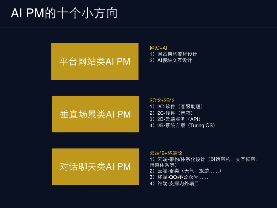 我接触到的AI PM,都在这些类别里面,大家需要找到自己适合的一个细分方向。