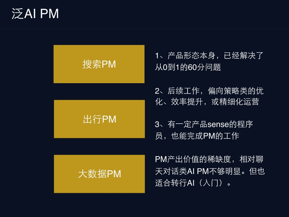 最难分类的的PM,比如关于搜索关于出行,比如说滴滴或者大数据的PM,我个人认为应该叫泛的AI PM,就是他们确实会跟比如说深入学习相关,但不是最典型的。因为这种产品形态本身已经解决了从0到60分的问题,用搜索框,那基本可以用了,后面得很多的,都是这种偏向策略的优化效率提升,或者精细化运营这一类事情,也就是说有一定的产品sence的程序员,他也可以去做部分的事情,所以综合来说就这一类它的产出价值的稀缺度,至少相对聊天来说不够明显,但也适合我们去入行。