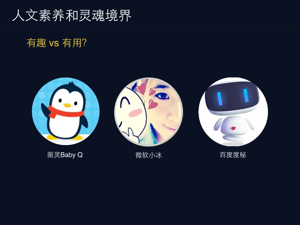 这三个产品,第一个是刚说的我们babyQQ群里面这个机器人,第二个微软小冰,第三个是度秘。那前面两个是思路是偏有趣,像百度度秘的偏有用,这两个方向,现在没有结论说谁对谁错,但是如果我们要去做这种产品的话,首先要有自己的理念才行,就自己不能是一个骑墙派。