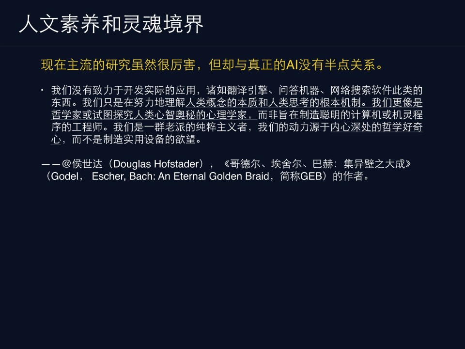 那这句话是侯世达说的,他说现在主流的研究虽然很厉害,但却与真正的AI没有半点关系。他这个人比较有意思,他不算是AI领域的主流,但是它是一个真正的思想者,他写的这本书《哥德尔、埃舍尔、巴赫:集异壁之大成》是关于AI一本特别奇特的书,很厚,但这本书是非常有影响力的。