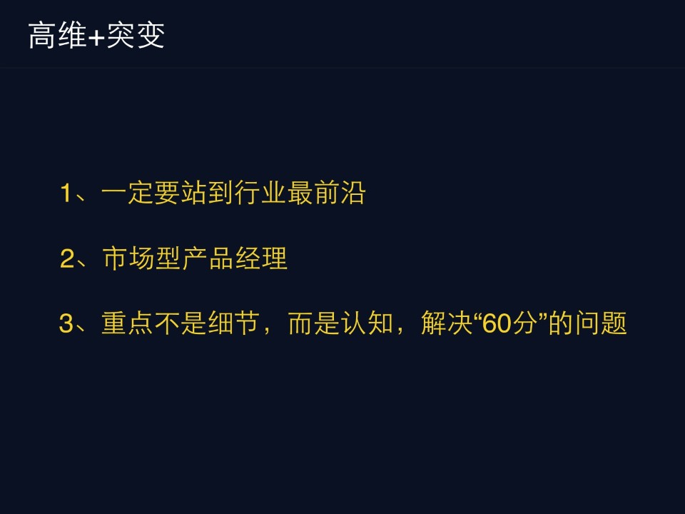 第一点是一定要占到行业最前沿,就这样的话才会更加的保险一点,否则的话很容易被别人给吞噬掉;第二点我们会强制要求我们的PM每隔一段时间去见客户,就是我们的销售反馈的用户意见跟你自己去看是不一样的,需要PM自己去接触实际的用户,听它们的声音,这个应该是跟互联网时代是很不一样的;第三点重点不是细节,而是认知,通过认知解决60分的问题。就是当我们去探索一个场景的用户的发展产品的方案时,第一步先去做简单的闭环解决60-70分的问题,但是当我们想去解决80-90分细节打磨的时候,很有可能一个新的小波浪又过来了,你就没有时间去做,就是迭代的太快了。所以啊基本上是说用6到12个月的时间去验证一个60分的问题,很有可能是AI PM的真正的价值,甚至可能是他的常态,包括AI PM和互联网PM可能就不是同一群人。那有的AI PM就会问,我们做这个产品什么时候是头,什么时候能够有用户量的大增长和爆发,什么时候能够有大的收入,有的人会觉得是遥遥无期。我个人认为是说这个反而它是一个正确的事情,他就应该花6到12个月去验证一个60分的事情,如果是不可行的,他就继续换一个细分的场景或者是交叉领域的蓝海的机会去验证,如果可行的话,他不需要做,它就把这个剩余的打磨工作交给传统互联网PM去做。