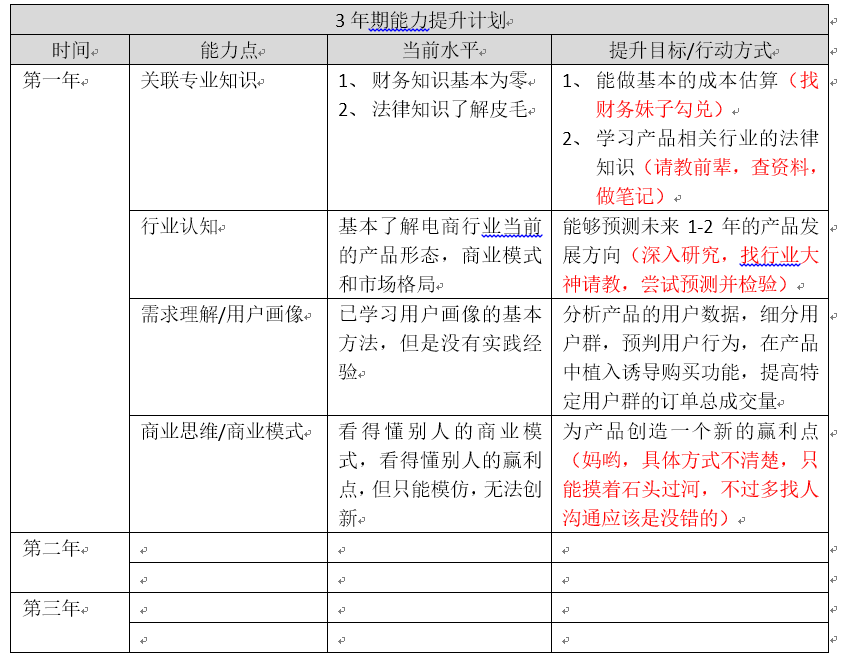 具体怎么用呢?依然是表格,仍旧是套路。评估当前能力,制定短期提升计划
