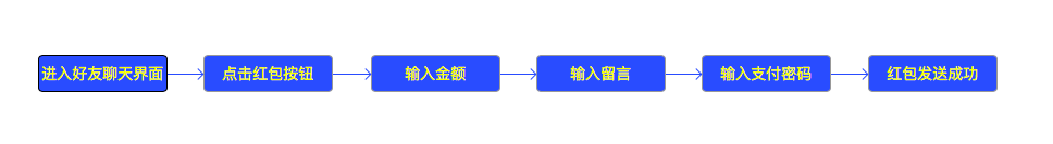 因此在画原型图之前可以花很少的时间先把流程图给画出来。流程图,顾名思义就是用来表达流程的图,可以使用各种工具,甚至可以手画;表现形式也可以是多种多样,只要能够帮助你理清业务逻辑、想清楚完整流程即可。比如下图是微信给好友发红包的一个简单流程图: