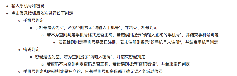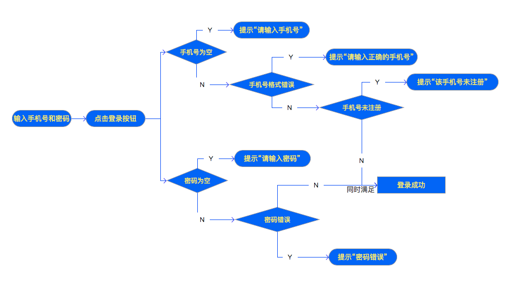 拿最简单的登录验证来举例子,用户输入手机号和密码后需要依次经过如下图所示的五个判定,缺一不可。