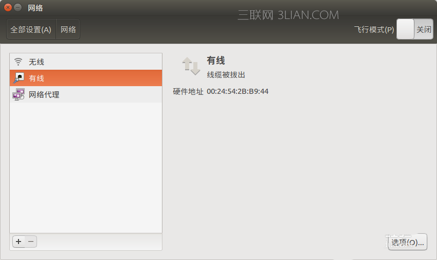 3、打开“有线网络”,然后选择“选项”对话框