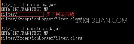 于是又搜索了下,勾选“Add directory entries”和不勾选有什么区别,还真有,通过命令“jar tf selected.jar”就可以查看到jar包中的内容,勾选了的jar包会展示目录层级信息,而没有勾选的就不会展示,估计是展示了目录层级的才能被spring扫描到吧。