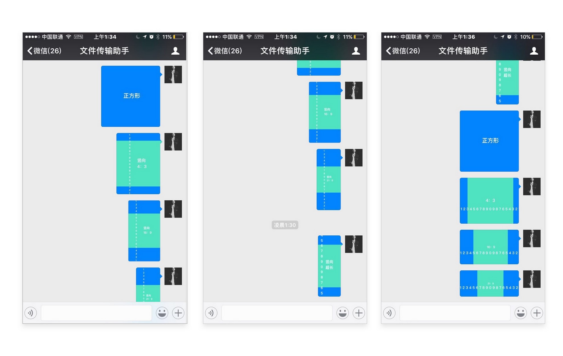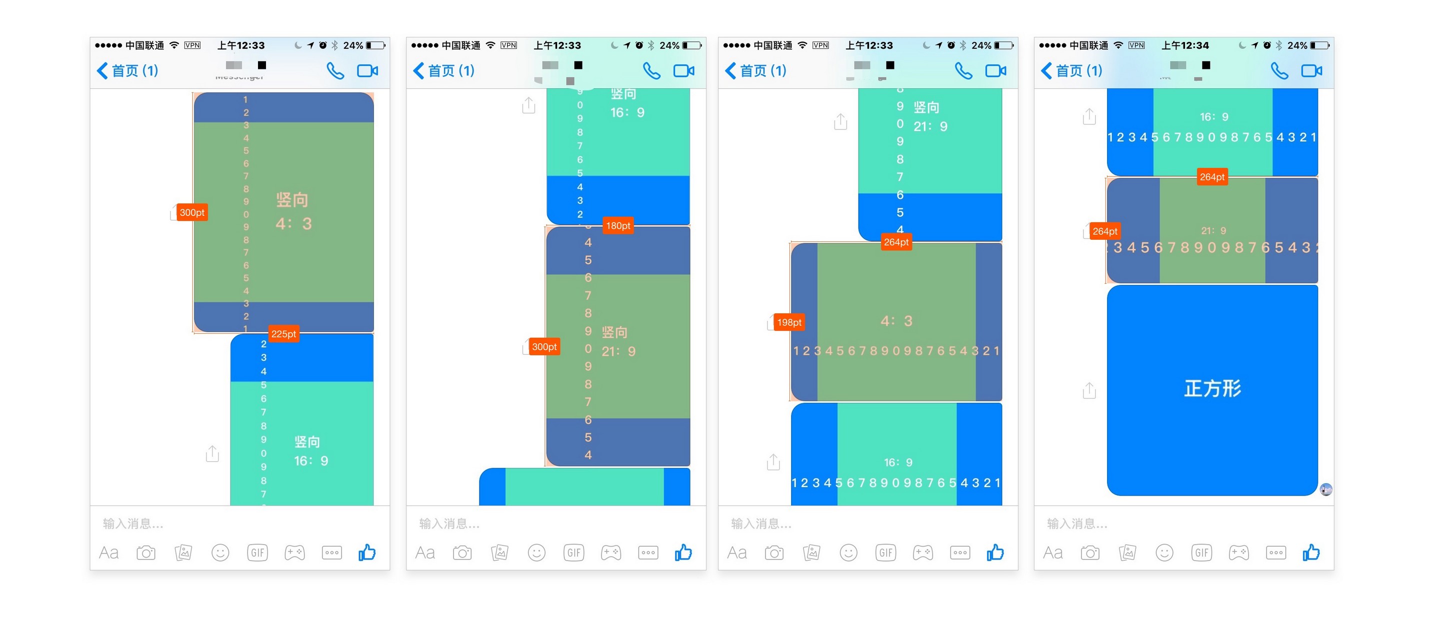用户发送的图片长短不一,有正方形的,有竖长形的,有横宽型的,甚至有不规则形的(比如一些用户保持的 png 表情)如何设计一个合理的缩略图展示规则能最大可能的满足展示需求,又让整个聊天列表整齐美观呢?