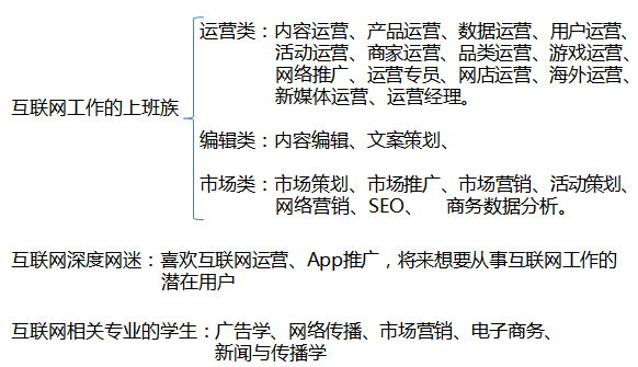 那么我们的目标用户就可以大体上分为从事互联网工作的上班族、互联网深度网迷、互联网相关专业的学生等。