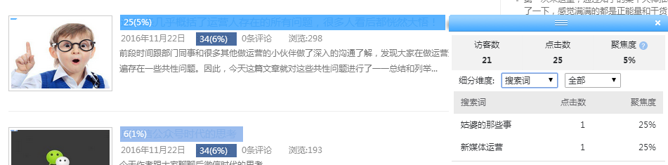 链接点击图带给我们的启示:从上图中我们发现,文章《这21条几乎概括了运营人存在的所有问题,很多人看后都恍然大悟!》的点击量明显偏高,这时我们可以继续点击该链接,对访问来源继续细分,比如可以查看搜索词,下拉菜单里就会出现用户搜索过的关键词,下图中我们可以看到有两个词,其中一个是“新媒体运营”,这就告诉我们,和新媒体运营相关的内容是近期比较受欢迎的内容,也是用户想要深度了解的内容。