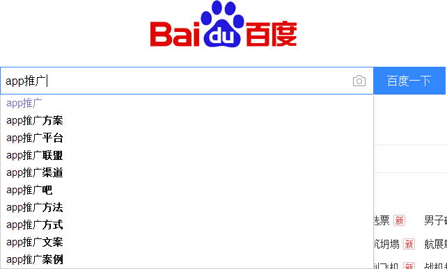 百度下拉框:下拉框是用户在百度的搜索框输入关键词的时候出现,它一般显示的是该关键词的短期需求。可以从下图看出“app推广”该关键词短期内有“app推广方案”、“app推广平台”、“app推广联盟”等需求。