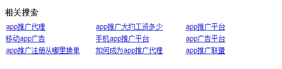 相关搜索:百度相关搜索用户搜索关键词后在结果页的底部出现,它一般显示的是该关键词的长期需求。可以从下图看出搜索“app推广”关键词的用户在长期内还有“app推广代理”、“移动app广告”、“app推广注册从哪里接单”等需求。