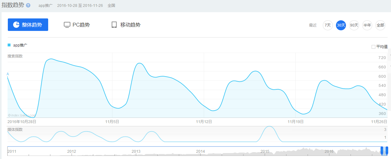 如下图所示,通过趋势研究曲线,我们可以知道一个关键词每年的搜索趋势和用户的搜索习惯,当用户搜索量增加的时候,我们网站的更新量可以同步增加。例如我们可以查询“app推广”这个关键词在近一周的变化趋势。网站内容就可以根据它的趋势图,适时增加相关内容。