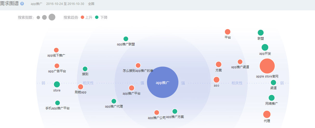 以“app推广”为例,看看它的需求分布图(如下图所示),在需求分布图中,越接近关键词意味着用户需求更强;其中,红色圆点表示用户对该词的搜索需求还在上升,圆点越大,表示未来该词会有更大的上升空间。所以,由下图可以看出,近期姑婆的内容可以涉及app推广平台、app推广方案等关键词。