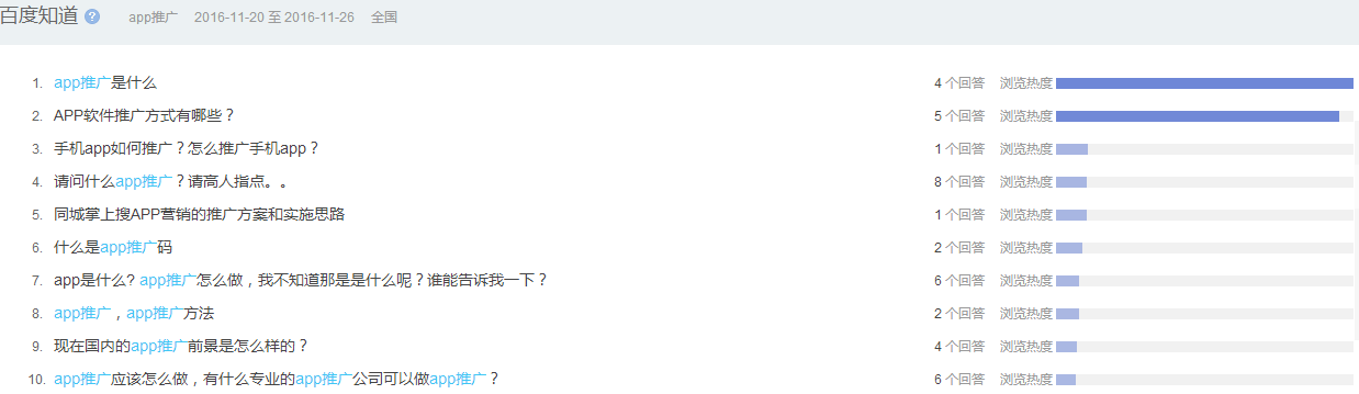 如下图所示,近一个星期内,大多数人在百度知道上的浏览的问题有“app推广是什么”、“APP软件推广方式有哪些?”、“手机app如何推广?怎么推广手机app”等。那么这些问题的相关内容都可以更新到我们网站内。