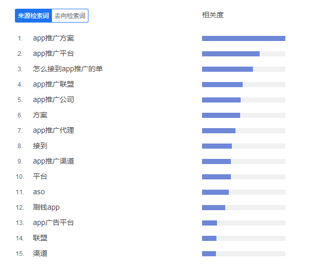 例如下图中表示,用户搜索了“app推广”的时候,同时还搜索过“app推广方案”、“app推广平台”、“怎么接到app推广的单”等关键词。