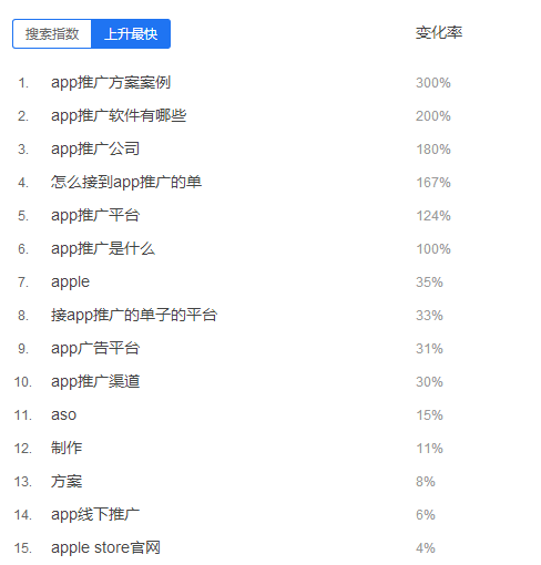例如下图中,我们可以看到“app推广方案案例”、“app推广软件有哪些”、“app推广公司”、“怎么接到app推广的单”等相关检索词按百分之130以上的趋势在增长。那么我们网站如果在近期更新这方面的信息,则会对收录和排名有很大的帮助。