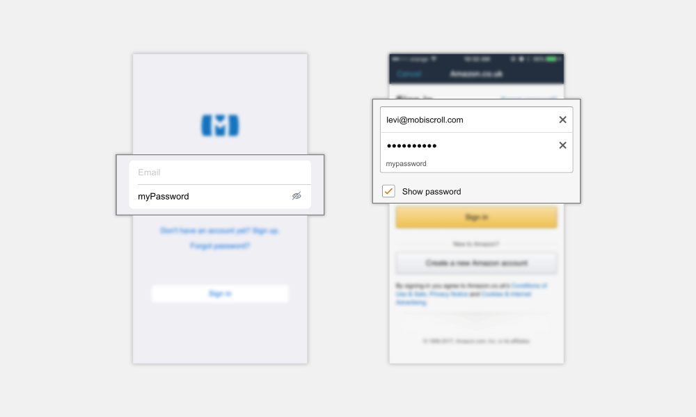 可以考虑让密码可见。这对用户登录和注册有帮助。不用再次输入确认,用密码输入框来切换显示隐藏,帮助用户确认首次输入是否正确。显示和隐藏的功能可以用一个小图标、一行文字标签、或者勾选框来表示。亚马逊对此做了些小变化,把隐藏字符保留在输入框里,在下方显示完整密码。增强了用户的信心,减少焦虑,表达出密码被妥善处理的事实。