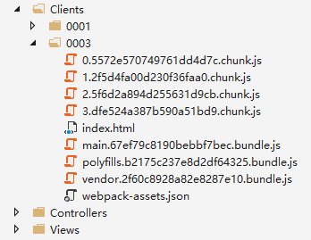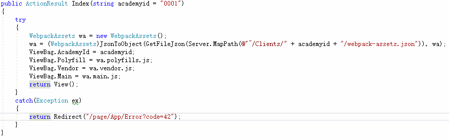 下一步是要在这个/App/Index中读取前端打包生成的webpack-assets.json清单,将需要的文件渲染到视图中,笔者项目添加了一个academyid来区分多客户端,每个客户端都有以自己id命名的一个资源目录,实现如下图所示: