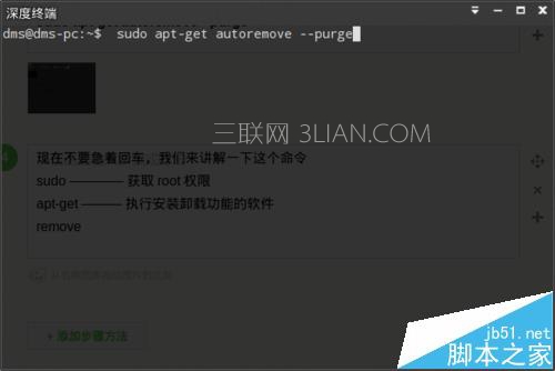 5、到了这里我们是不是还差点什么?对了,我们还没告诉他们卸载什么软件呢。那么在 --purge 后面间隔一个空格开始写软件名称。比如我就要写。