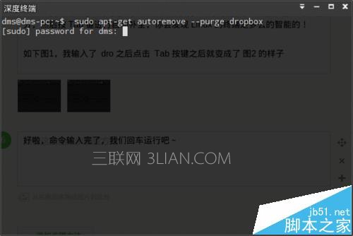 Dropbox 在这里我告诉大家一个小技巧:如果软件名称太长,我们可以只输入前边的一部分,然后按 Tab 键进行自动补全,你会发现 Linux 的终端是多么的智能的!如下图1,我输入了 dro 之后点击 Tab 按键之后就变成了 图2 的样子