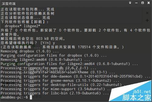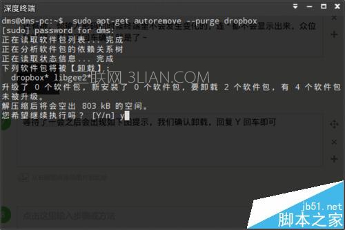 7、等待了一会之后会出现如下图提示,我们确认卸载,回复 Y 回车即可 Linux卸载Dropbox的教程