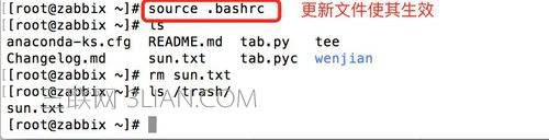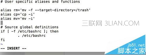 3、更改bashrc环境,在.bashrc修改alias rm='mv -f --target-directory=/trash,如图所示