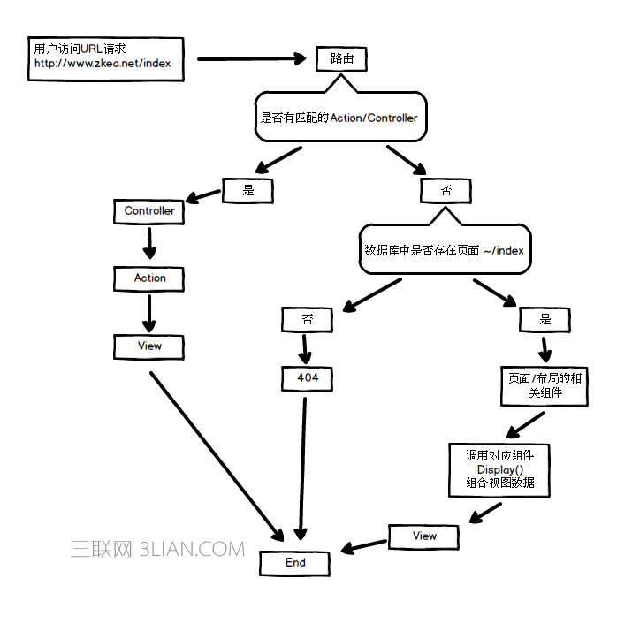 优先级最低的“全捕捉”路由是用来处理用户自行创建的页面的。当请求进来时,先去数据库中查找是否存在该页面,不存在则返回404。找到页面之后,再找出这个页面所有的组件、内容,然后统一调用各个组件的“Display"方法来来得到对应的“ViewModel"和视图"View",最后按照页面的布局来显示。