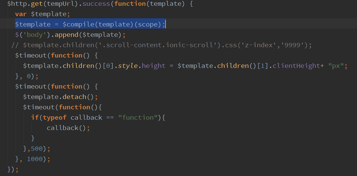 2. 重点注意 $template = $compile(template)(scope); 这句代码非常重要 用于激活模板内容转成angular能识别的html代码片段